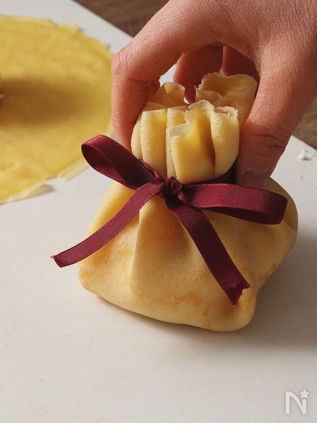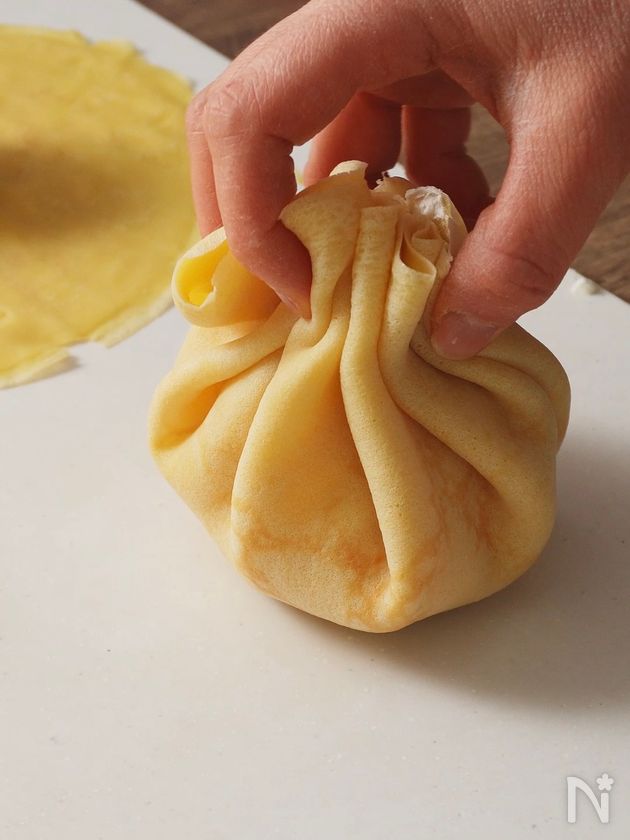 (7) 生地を対角線上に持ち上げ、巾着のように包む。
