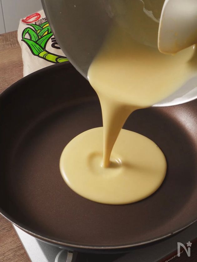 (3) フライパンに米油(生地を焼く用)を入れ中火で熱し、薄くのばす。