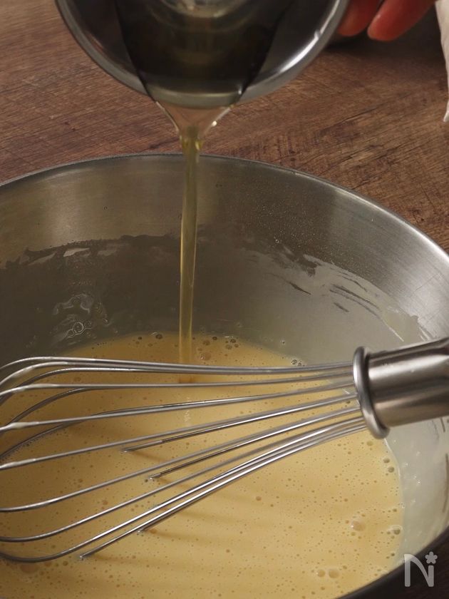 (2) 1に牛乳、全卵、水、米油を順に加える。卵は1個ずつ加え、その都度しっかり混ぜてから次の材料を加える。