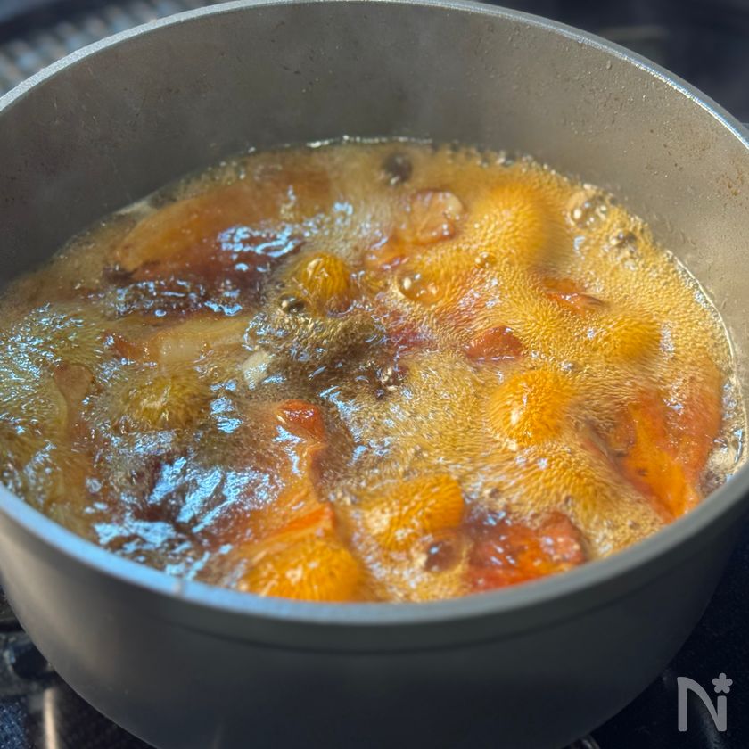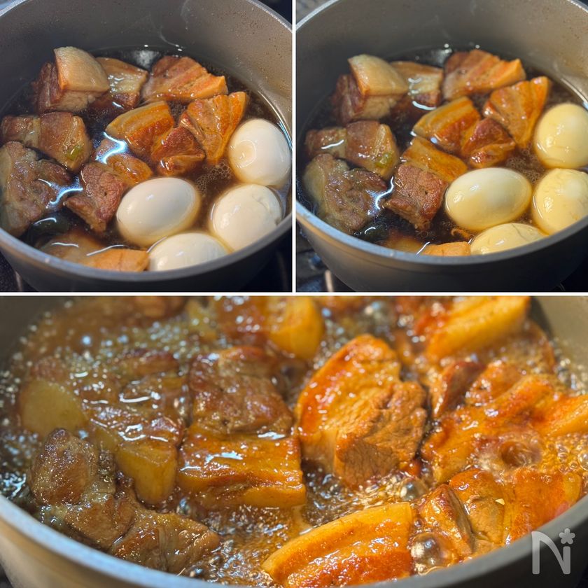 ・弱火でじっくり煮込み、豚肉を柔らかく仕上げます。