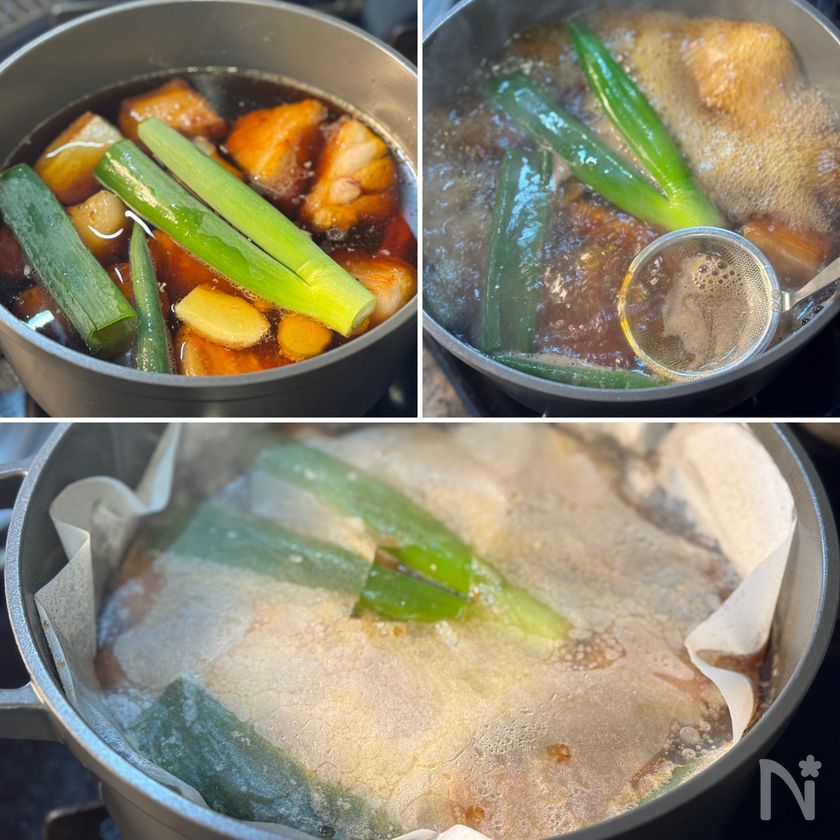 (2) 鍋に水800mlと【A】を入れて軽く混ぜ、1の豚バラ肉、生姜、長ネギの青い部分を加えて火にかける。煮立ったらアクを取り、クッキングシートなどで落とし蓋をし、弱火で1時間10分〜1時間20分ほど、豚バラが柔らかくなるまで煮る。