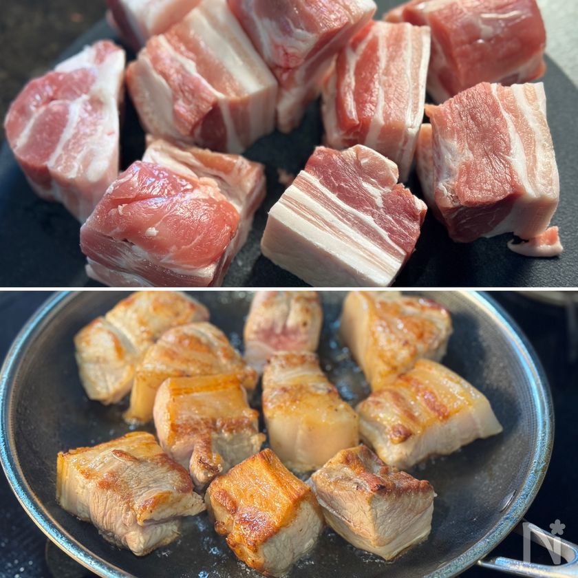 (1) 豚バラ肉ブロックを4cmほどの厚さに切る。中火で温めたフライパンに豚バラ肉を並べて焼く。全面に焼き色がついたら取り出し、キッチンペーパーなどで余分な油を拭く。