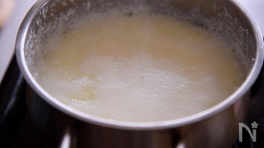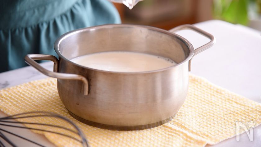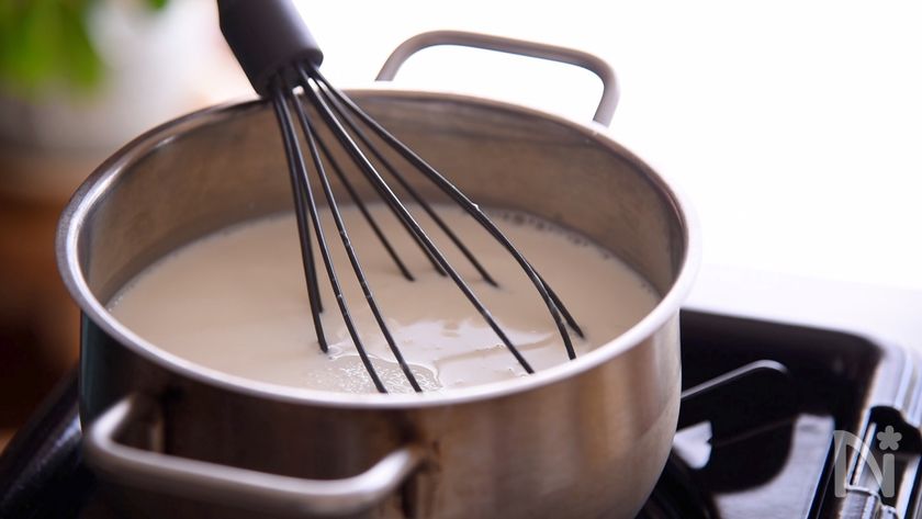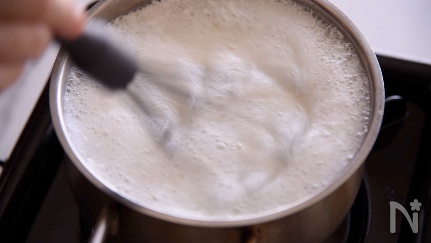 (2) 牛乳とヨーグルト(無糖)を鍋に入れ火にかけます。レモン汁を入れて、煮ていきます。
