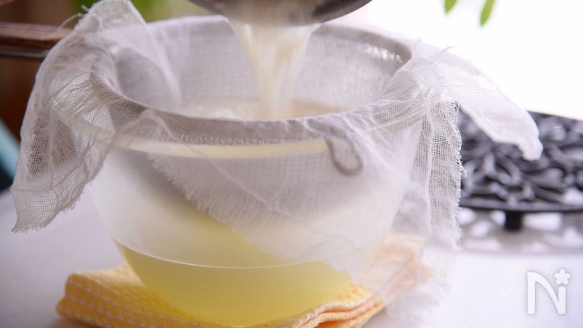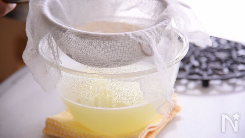 (6) ガーゼにゆっくり流し込み水切りします。この時黄色い汁がたくさん出ます。これはホエーです