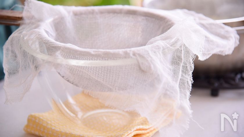 (下準備) ボールにザルを置いて、その上に清潔なガーゼを、置きます。