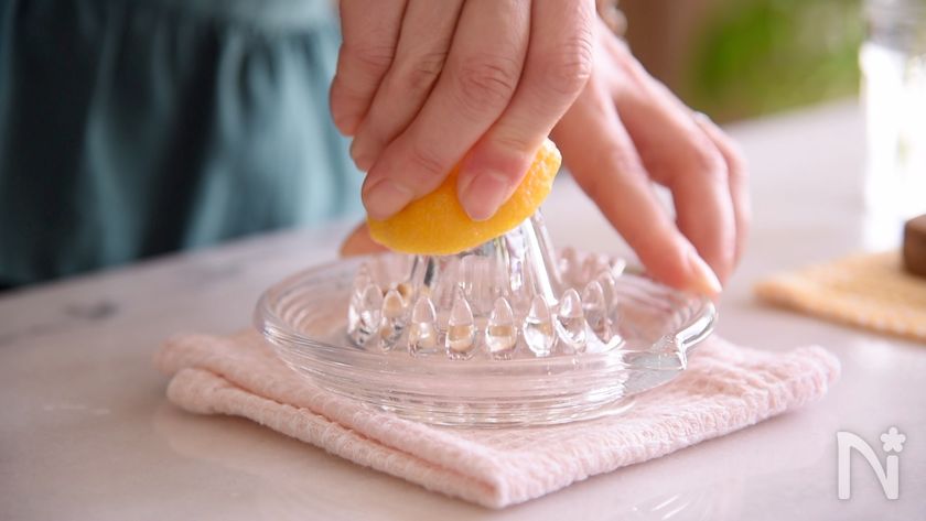 (1) レモンを絞っておきます。ポッカレモンでもかまいません
