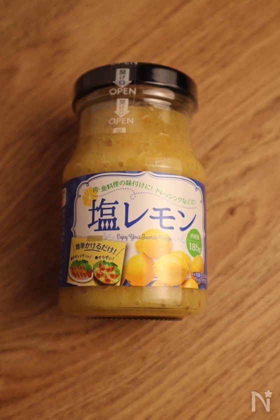 (3) 業務スーパーの塩レモンを使用しました。さっぱり感の中にほのかな塩味があり、肉料理にも魚料理にも使える万能調味料です。鶏肉や魚の下味、ドレッシングなど幅広く使えます。瓶のフタを開けるとレモンをすりおろしたような見た目で、爽やかな香りがふわっと広がります。少量でもしっかり風味が出るので、常備しておくと料理の味がぐっと格上げされます。