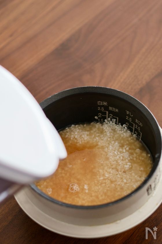 (3) 工程2に工程1を入れて、炊飯する。炊き上がったらお好みで刻み青ねぎを散らす。
