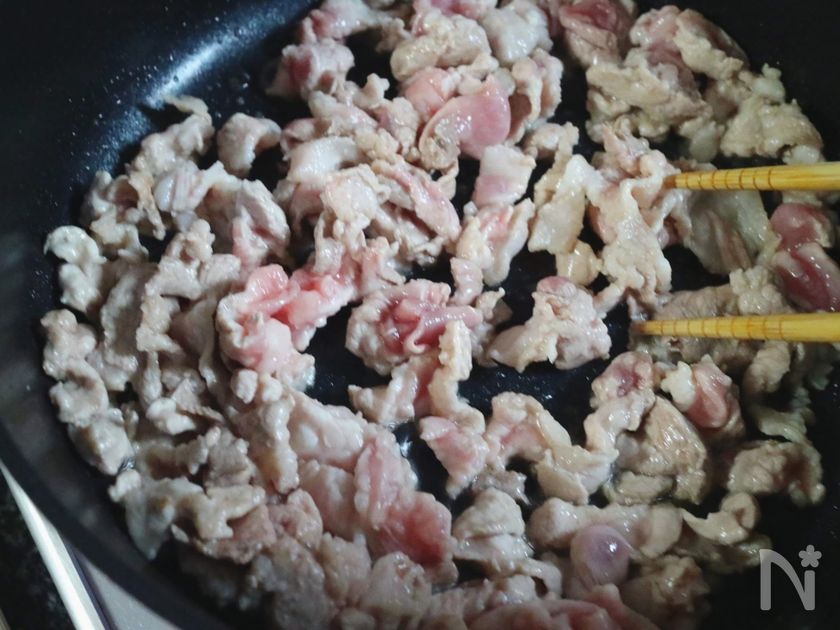 (2) フライパンにごま油を入れ、中火で豚肉を加えて炒める。