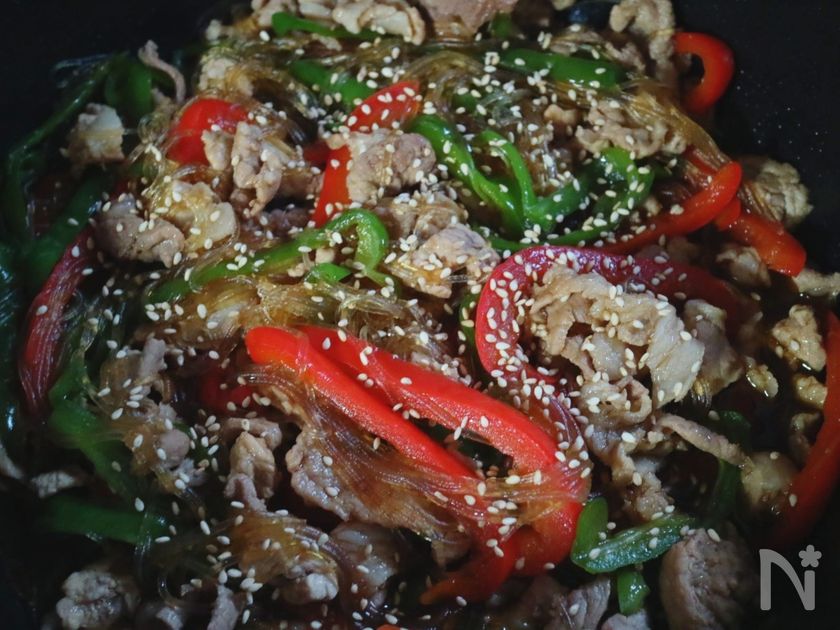 (4) 春雨が透明になってきたら、ピーマン、パプリカを加えてサッと炒め、汁気がなくなってきたら白ごまを振る。