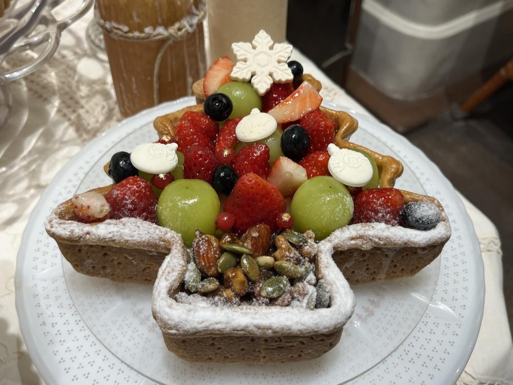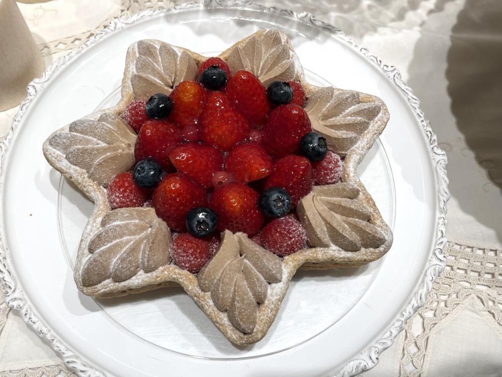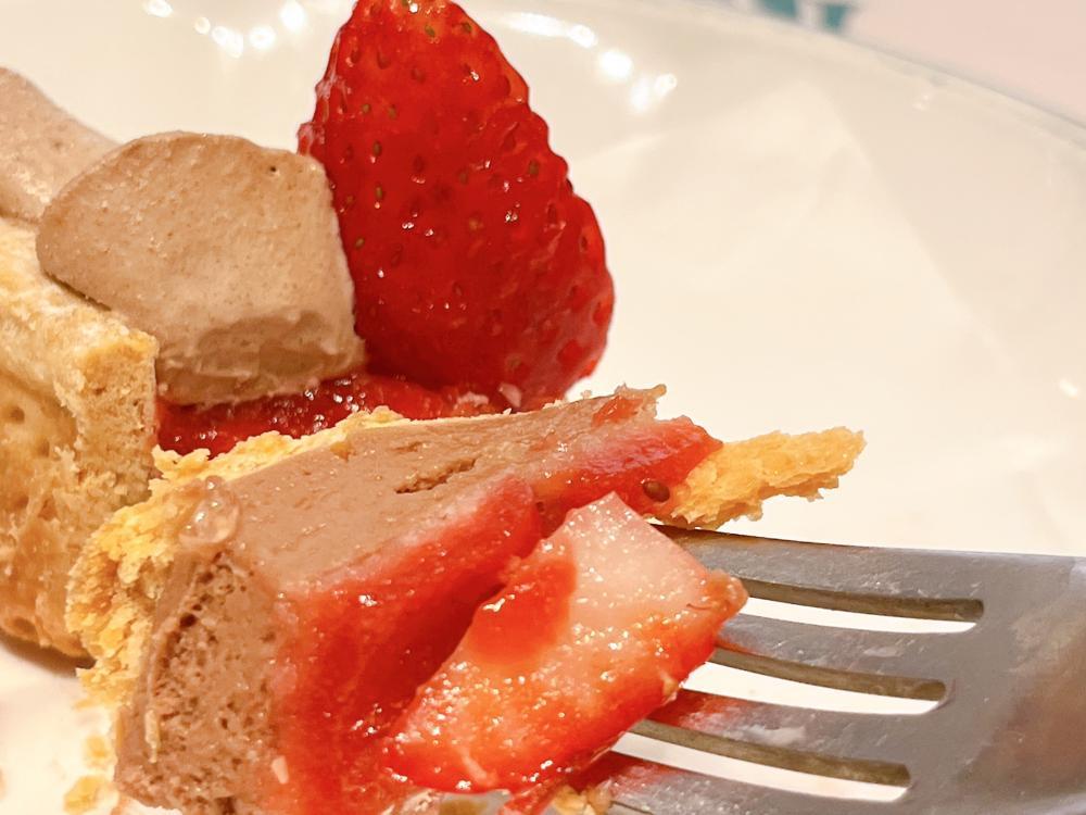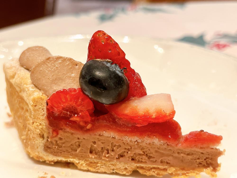 チョコクリームがふんわり口に広がります。ミルキーな味わいで軽さがあるのでぺろっと食べられます。ベリーやジャムの酸味がアクセントになり、大人も子どもも大満足するチョコタルトでした。