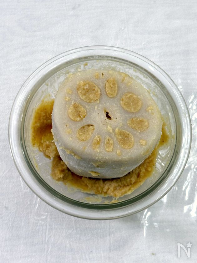 (3) れんこんの切り口を、②の辛子味噌に押し当て、れんこんの穴に辛子味噌を詰め、冷蔵庫で6時間ほど寝かせる。