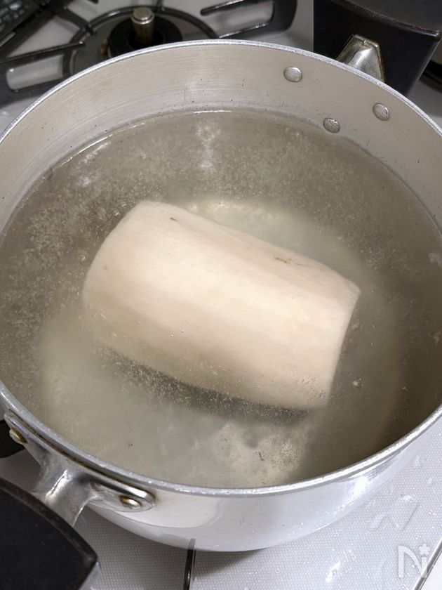 (1) れんこんは、節を切り落として、皮をむいて鍋に入れ、かぶるぐらいの水(分量外)を注ぎ、酢を加え、中火にかけて、沸騰してから10分ゆでる。