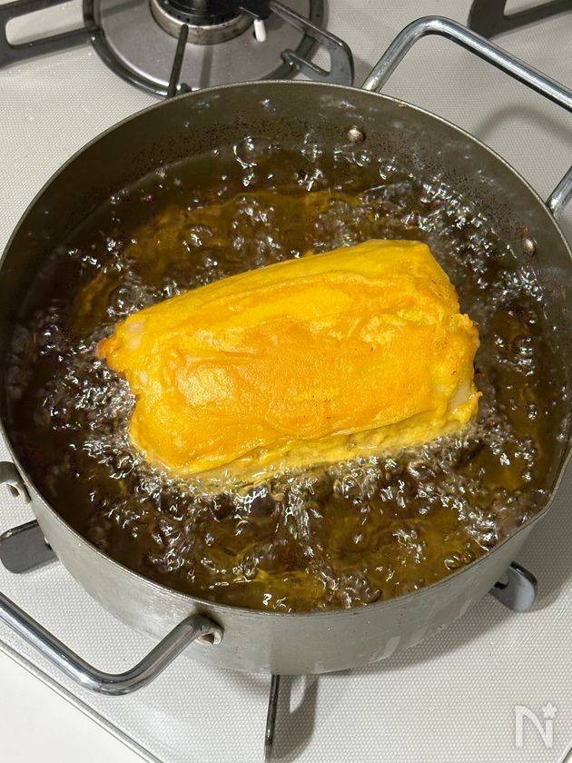(6) 揚げ鍋に、サラダ油を注ぎ、170℃まで温度を上げたら、れんこんを入れ、転がしながら衣がキツネ色になるまで揚げる。