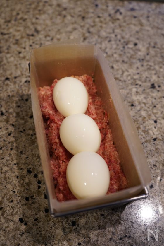 (2) 型に②の1/3を敷き詰め、殻を剥いた卵を入れる。