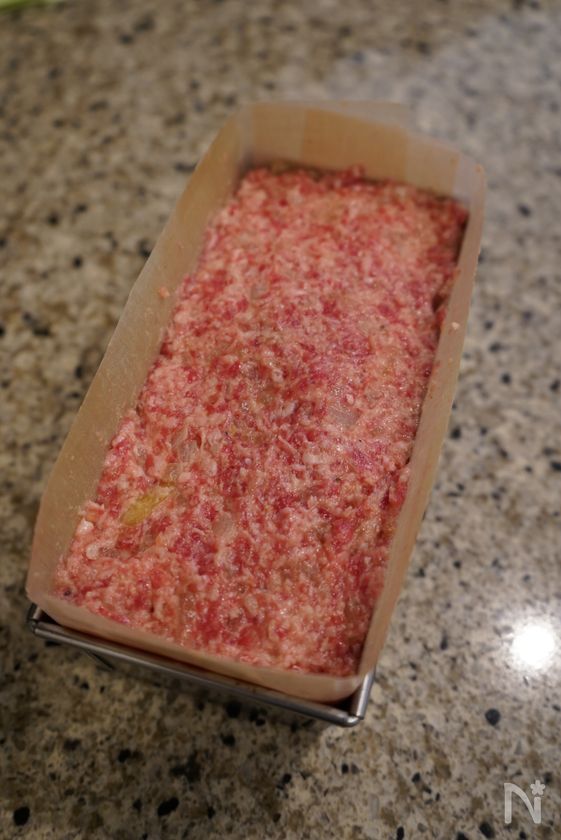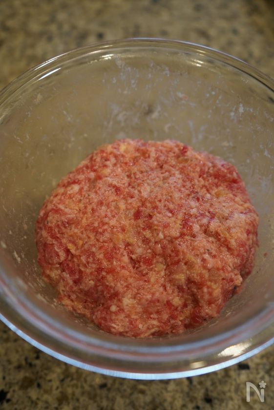 (1) ボウルによく冷えた合挽き肉と塩(ミートローフ用)を入れてしっかり混ぜる。