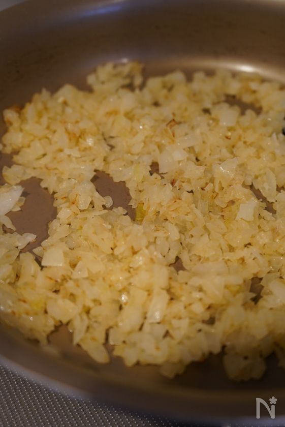 フライパンにサラダ油を入れて火をつけ、玉ねぎのみじん切りを飴色になるまで炒め冷ましておく。