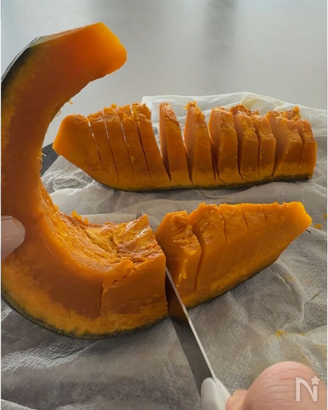 (2) 柔らかくなったかぼちゃを縦にカットし、切り込みを入れる