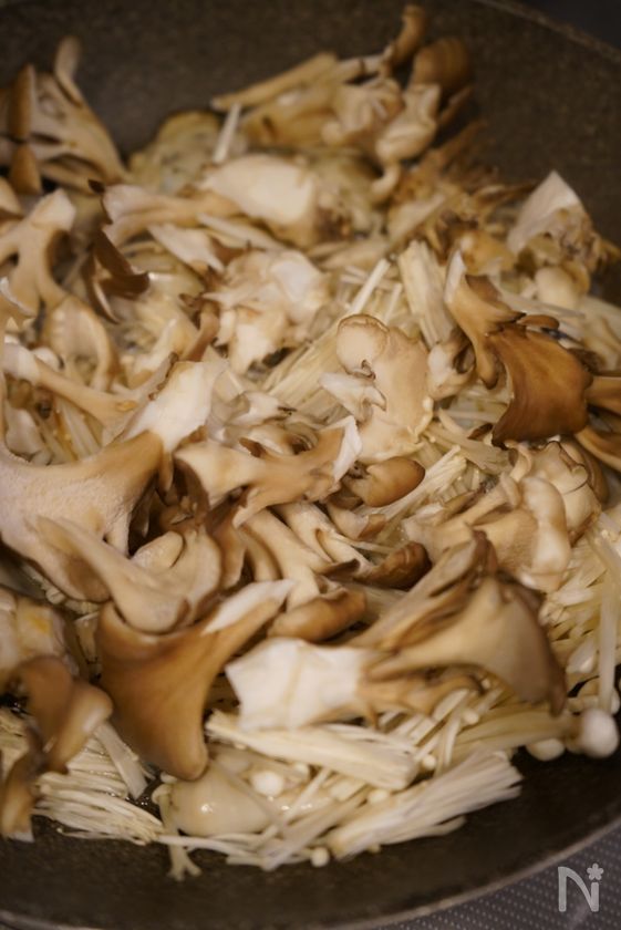 にんにく、えのき、舞茸、白ワインを入れて蓋をし5分ほど蒸し焼きにする。