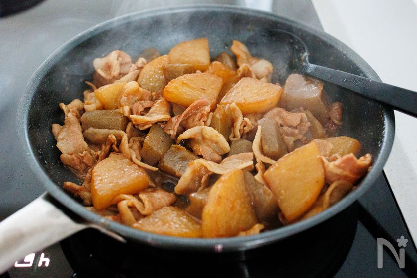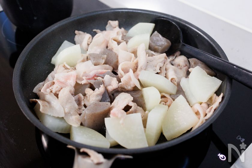 (3) 2のフライパンを中火で熱し、豚肉を炒めて火が通ってきたら、こんにゃくと大根を加えて軽く炒め合わせる。