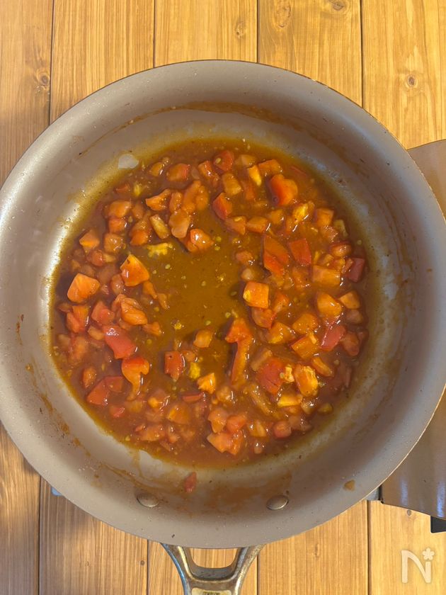 (4) 同じフライパンにトマトを加えて中火で炒める。