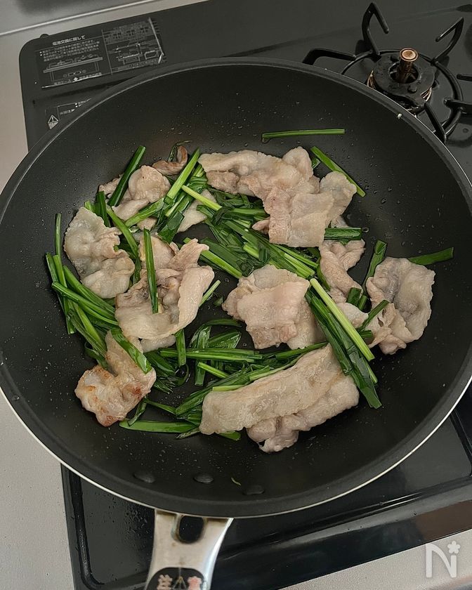 (3) 同じフライパンにごま油を中火で熱し、豚バラ薄切り肉を炒める。色が変わってきたら、ニラを加えて30秒ほど炒める。