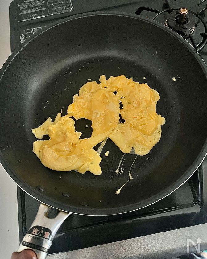(4) ②の卵、混ぜ合わせた【A】を加え、味が馴染むまで炒める