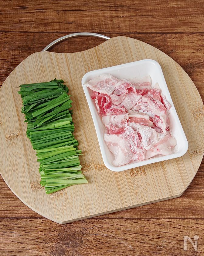 (1) 豚バラ薄切り肉は食べやすい大きさに切ったら、塩こしょうを振り、片栗粉をまぶす。ニラは4cm幅に切る。