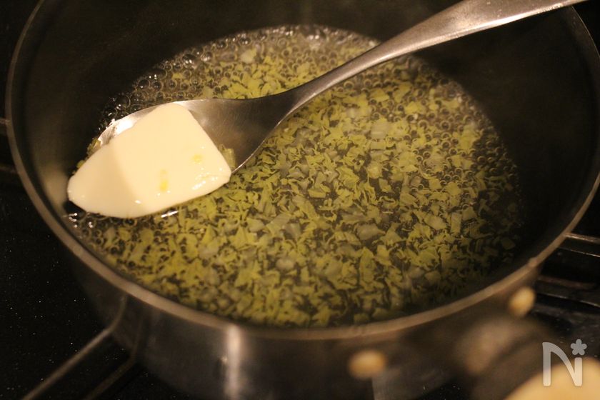 (2) 小鍋にだし汁と白菜を入れて中火にかけ、煮立ったら蓋をして弱火で5分ほどやわらかくなるまで煮る。