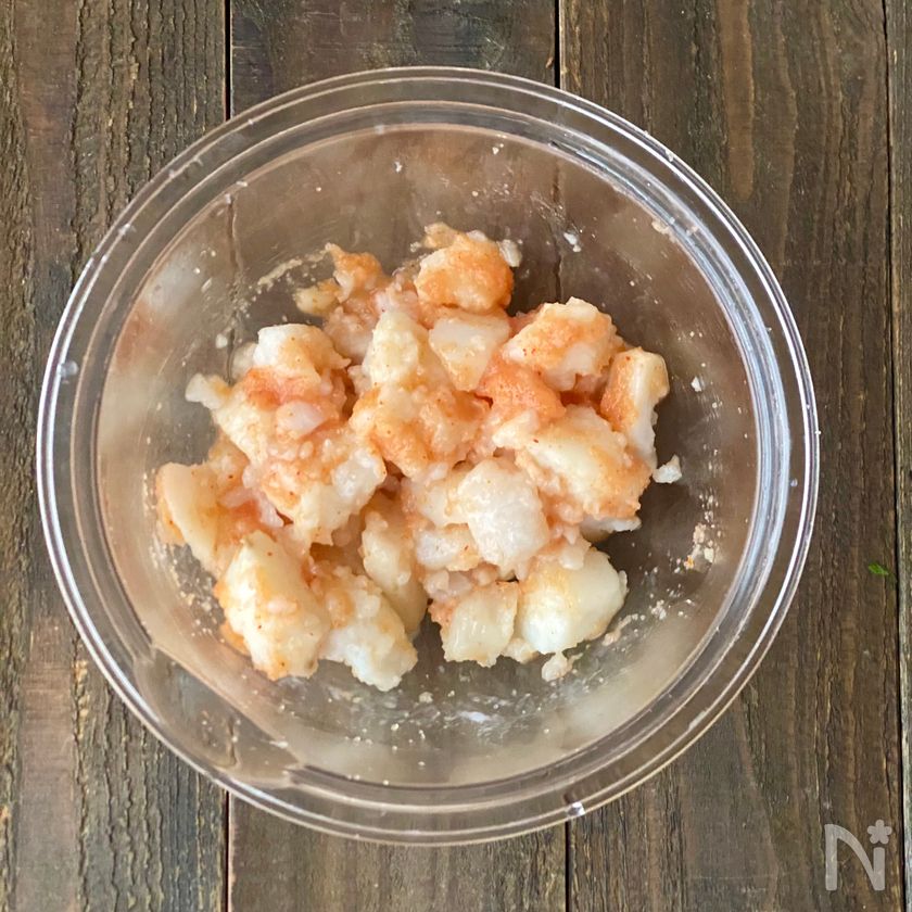 (3) ボウルに白だしを加えて長芋を加えてさっくり混ぜ、続いて明太子を加えてやさしく和える。