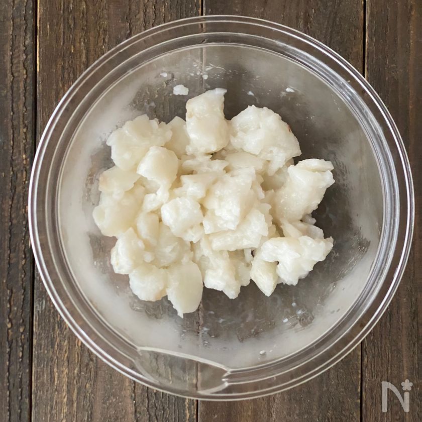 (2) 加熱した長芋をフォークで荒く潰して粗熱を取る。