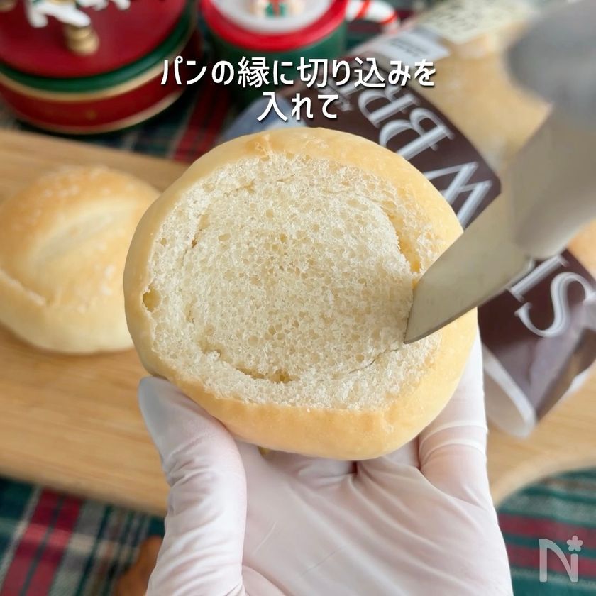 (2) パンの縁に切り込みを入れる。