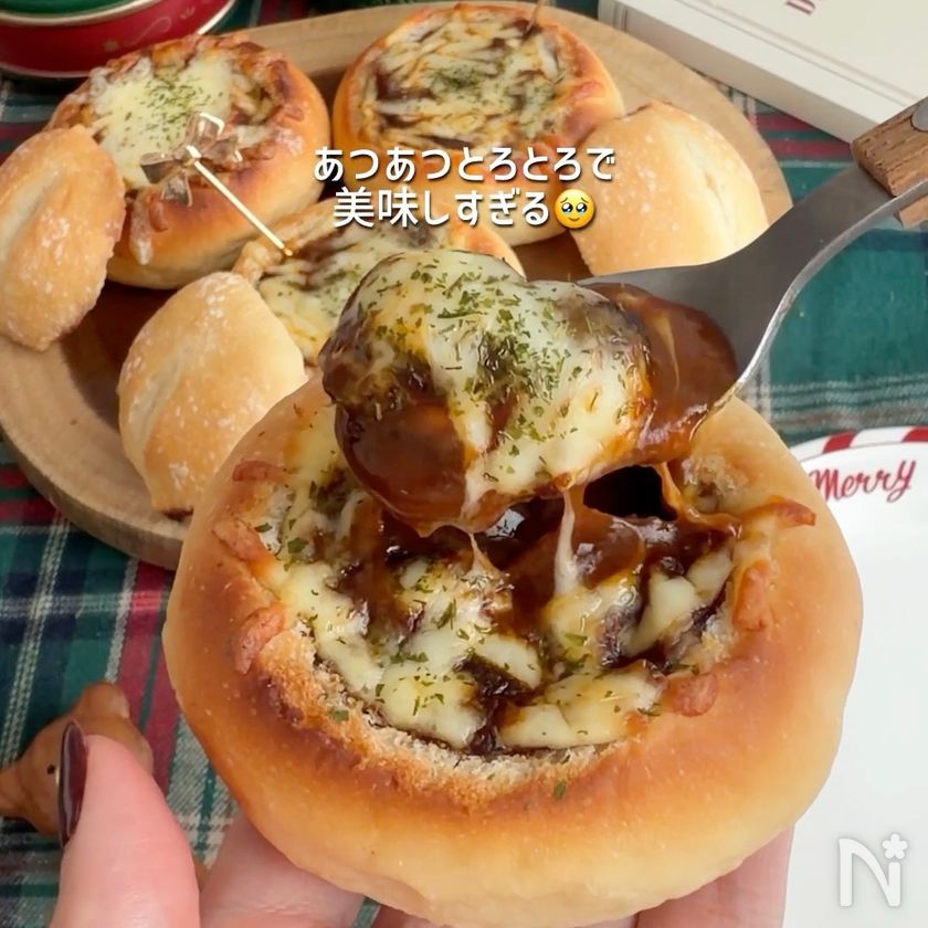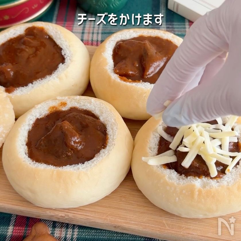 (4) 穴の空いた部分にレトルトのビーフシチュー(富良野市場)を入れ、チーズをかける。