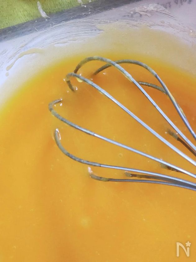 (3) 卵黄・バニラオイルを入れてよく混ぜ、
