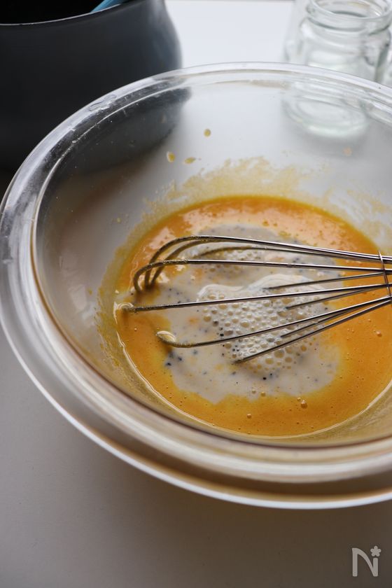 (4) 白っぽくなれば、②を少しずつそそぎ入れる。その都度全体を混ぜ合わせる。