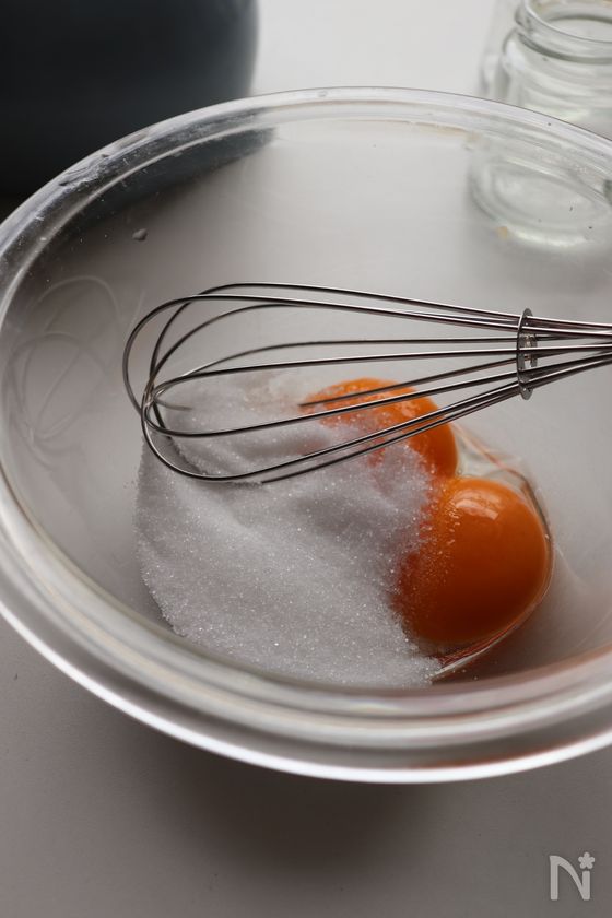 (3) ボウルに卵黄とグラニュー糖を入れ、泡立て器で混ぜ合わせる。