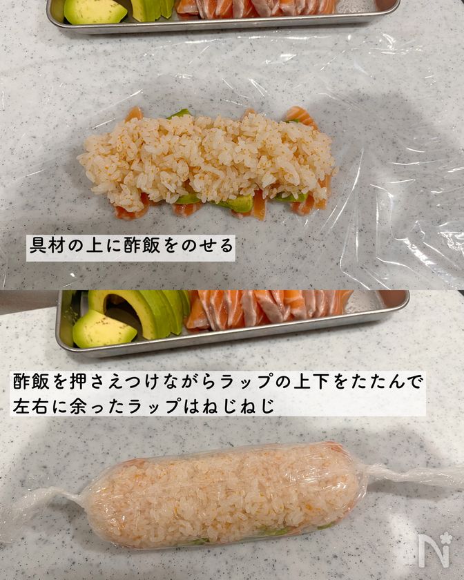(6) 酢飯を押さえつけながらラップの上下をたたんで、左右に余ったラップはねじねじ♪