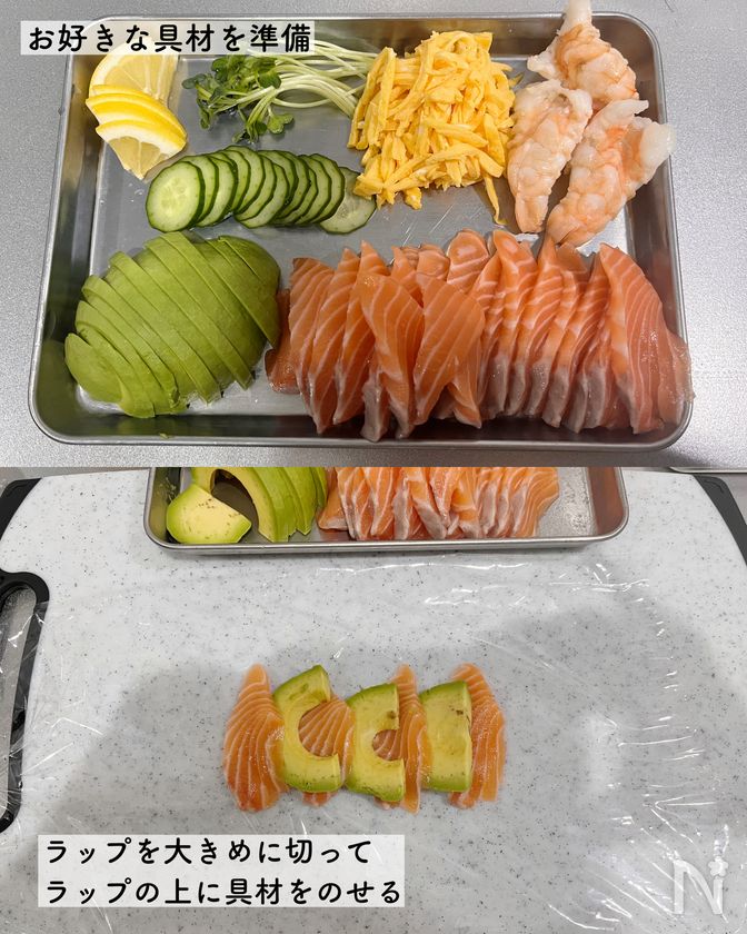 (レモン、かいわれ大根、きゅうり、錦糸卵、ボイルえび、アボカド、サーモンなど)
