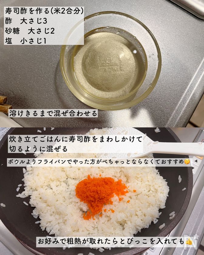 ボウルよりフライパンの中で酢飯を混ぜる方がべちゃっとならなくておすすめ🤫