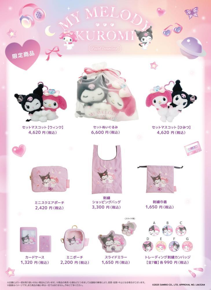 「セットぬいぐるみ」(6600円)や「刺繍ショッピングバッグ」(3300円)、「トレーディング刺繍缶バッジ」(全7種/各990円)などの限定商品に、「3連アクリルキーホルダー」(全2種/各968円)、「ステンレスタンブラー」(3300円)、「シークレットアクリルミラーシール」(全10種/各660円)をはじめとする50点以上の商品、そしてイラストブランド「DOLLY MIX(どーりーみっくす)」とコラボした先行販売商品が並びます。