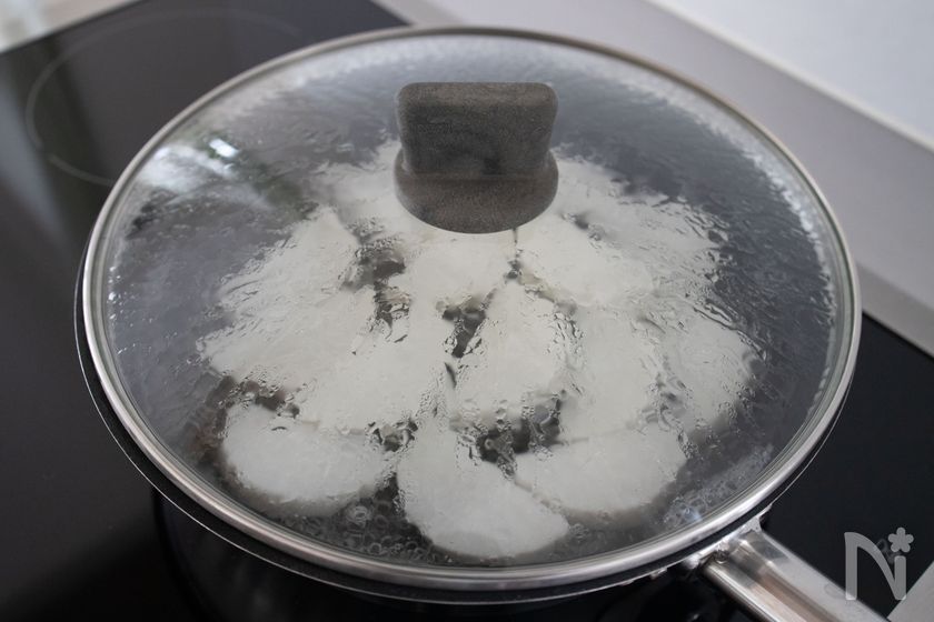 (1) 大根は1㎝幅の半月切りにする。フライパンに大根とかぶるくらいの水を入れて火にかける。やわらかくなるまで12分ほど茹で、水気を切る。