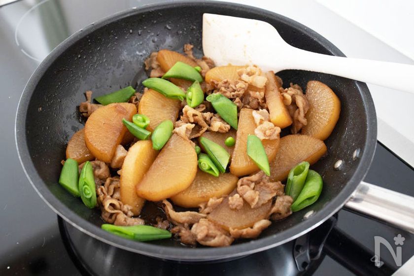 (3) フライパンを中火で熱し、豚肉を炒める。火が通ってきたら大根を戻し、【A】を加える。