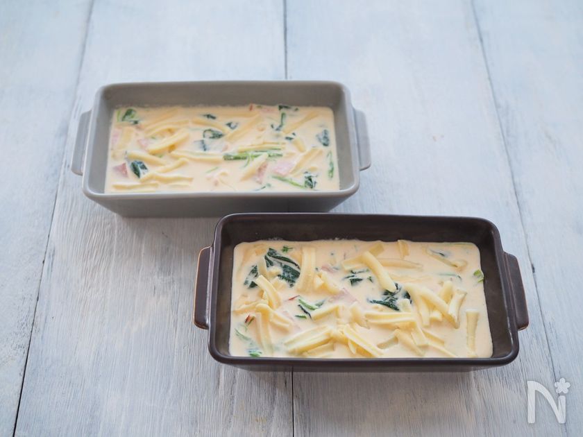(3) ベーコンとほうれん草も加えて混ぜたら、耐熱皿に移す。
