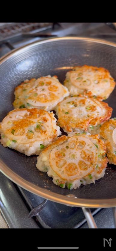 (3) フライパンにごま油を塗り広げ、そこへ薄切り蓮根を並べる。その上にタネをのせ広げ、丸く整える。