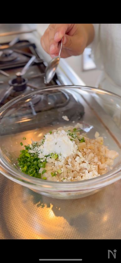(2) ボウルに、先程の蓮根すりおろしとみじん切りを合わせる。小ねぎをハサミなどで切り入れ、【A】も加え、混ぜ合わせる。