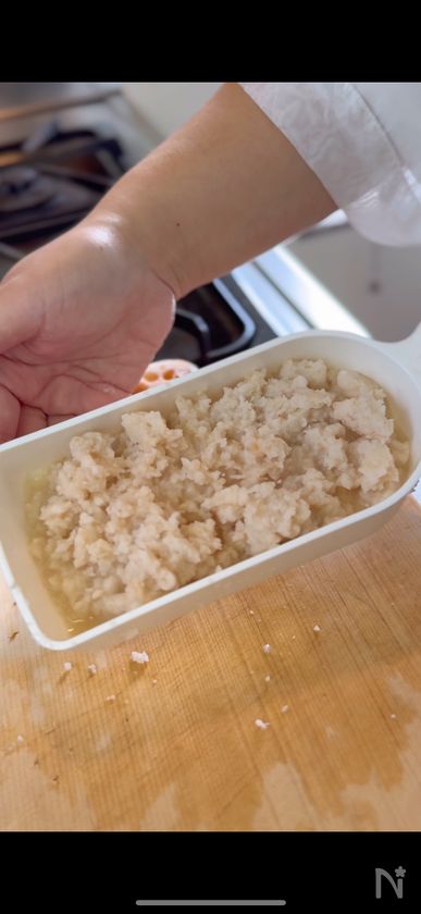 (1) 蓮根は皮をむくかアルミホイルを丸めたものなどでこそぎ落とし、4/5程度をすりおろす。