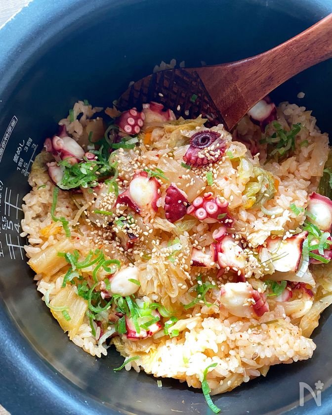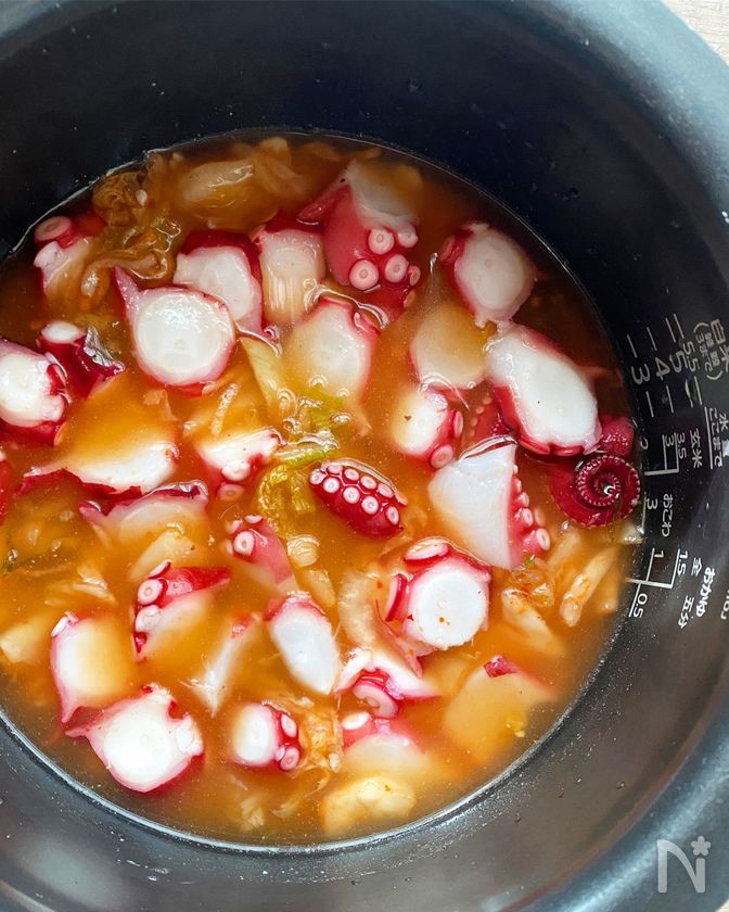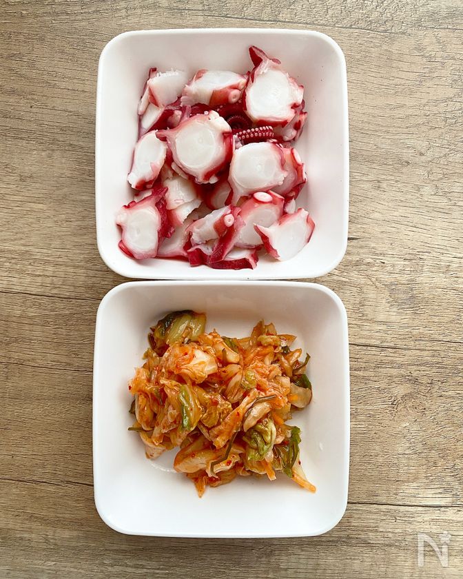 (下準備) ○ゆでたこ、キムチは食べやすい大きさに切る。