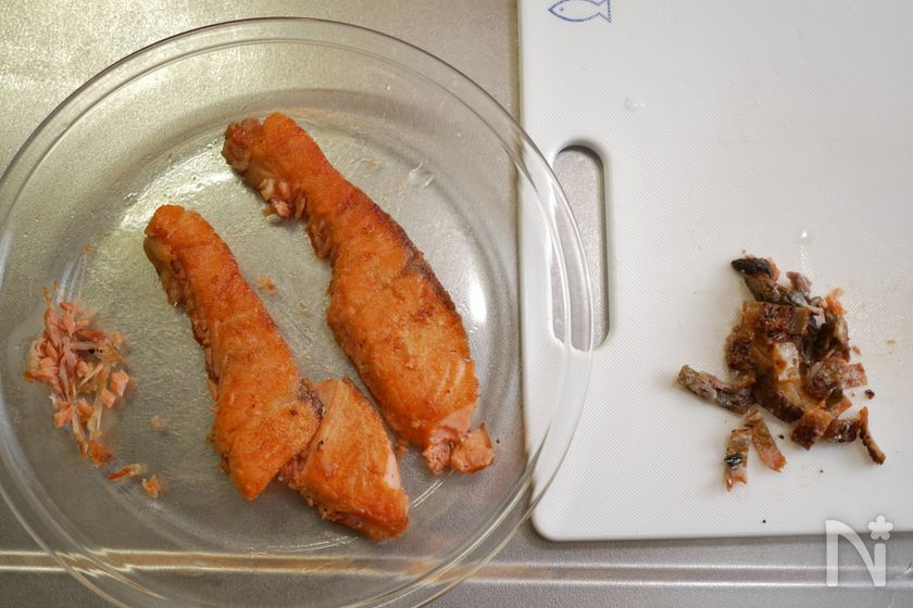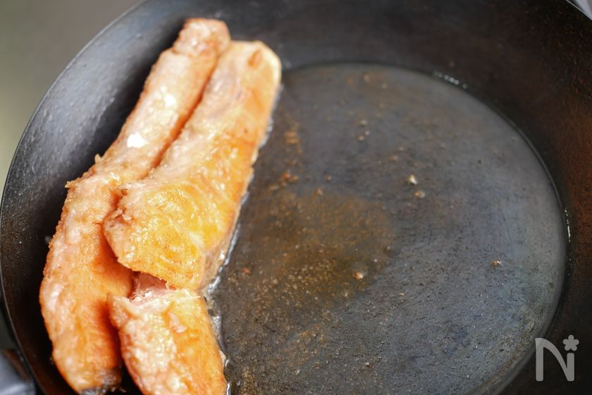 (3) フライパンを中火で温め油を大さじ1ひく。鮭を入れて両面こんがり焼く。