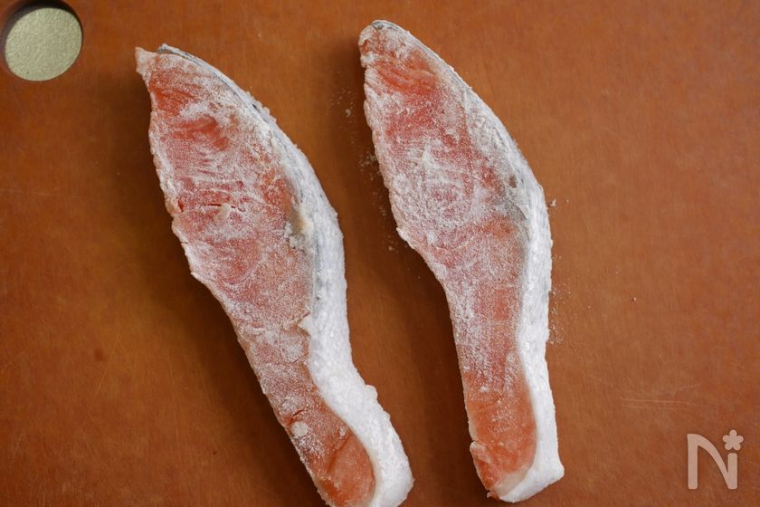 (2) 塩鮭に薄く全体に小麦粉をつける。