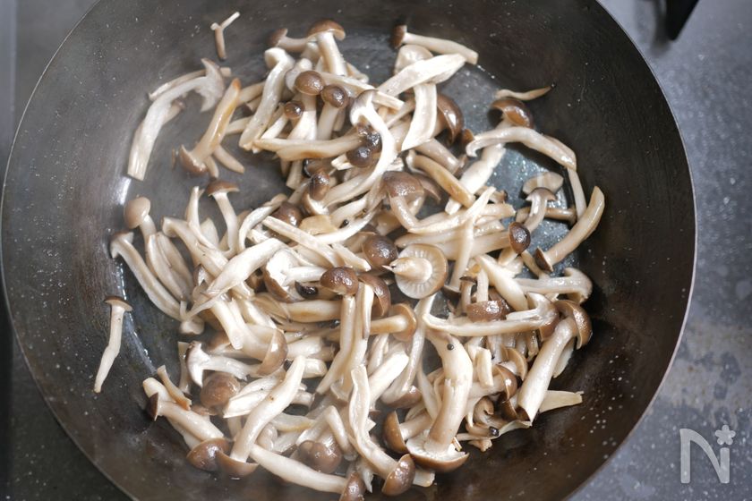 しめじもじっくり蒸して旨味を引き出します。こうすると特有の香りが抑えられ、食べやすくなりますよ♪